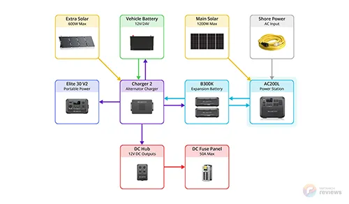 - Air conditioner: The system caps out at 50A DC (using DC Hub). If you plan to run a DC air conditioner, the BLUETTI RV5 (see review) or EcoFlow Power Kit might better suits your high-amperage needs.