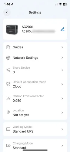 The BLUETTI AC200L pairs with the BLUETTI app to allow for device monitoring and customization of default settings. The app is available on iOS and Android. The screenshots below show all currently available options, ordered exactly as they appear in the settings menu.